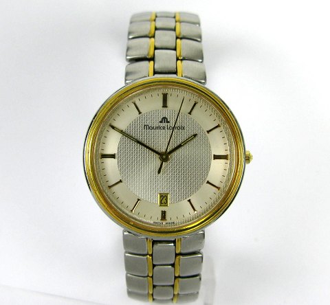 Maurice Lacroix herrearmbåndsur, Ref. nr. 2969 i urkasse og med lænke af forgyldt stål. Sølvfarvet struktureret skive bag safirglas, central sekundviser og datovisning i #6 positionen. Quartzværk. Urkasse diameter 36 mm.