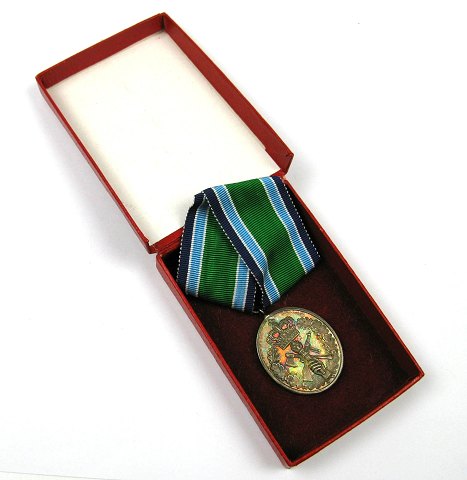 For 25 år frivillig tjeneste i Hjemmeværnet, 33 x 28 mm. Original opbevaringsæske med tryk i form af guldkrone medfølger.