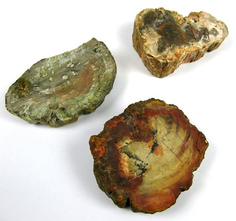 3 stk. opskårne og ensidig slebne segmenter af ca. 180 millioner gammelt forstenet træ. Diameter ca. 60 - 70 mm.