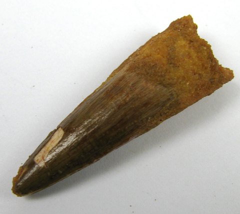 Forstenede Spinosaurus tand, L. 45 mm. Spinosaurus dinosaur var 12 - 15 mtr. lang og kunne veje op mod 7 tons. Tandsættet beståede af en række større og mindre hugtænder.