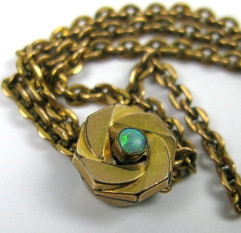 Gulddoublé lommeurkæde med segmenteret løber, prydet med flot opal, diameter 3,5 mm. Kæde L. 38 cm.