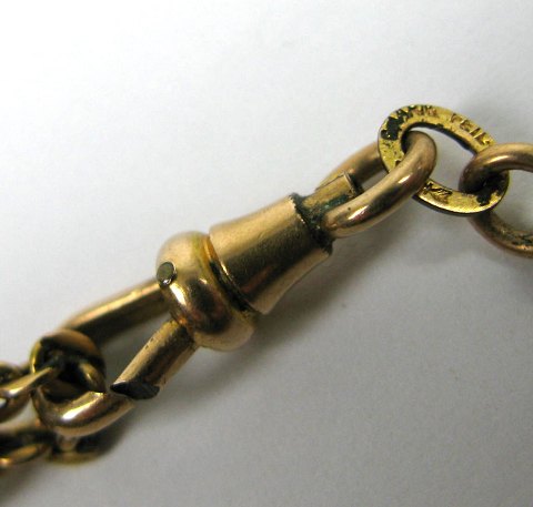 Gulddoublé lommeurkæde med segmenteret løber, prydet med flot opal, diameter 3,5 mm. Kæde L. 38 cm.