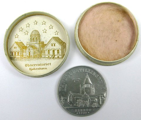 Landsudstillingen Aarhus 1909, erindringsmedaille af aluminium med motiv fra udstillingen og evighedskalender på bagsiden. Diam. 38 mm. Original salgsetui med motiv fra udstillingen, indvendig guldtegning af Observatoriet Kjøbenhavn. Diameter 39 mm.