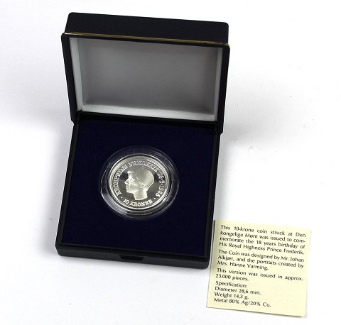 10 kr SØLV 1986 med riflet rand. Mønten er designet af tegneren Johan Alkjær i anledning af Kronprins Frederiks 18 års fødseldag. Portrætterne er udført af billedhuggeren Hanne Varming.