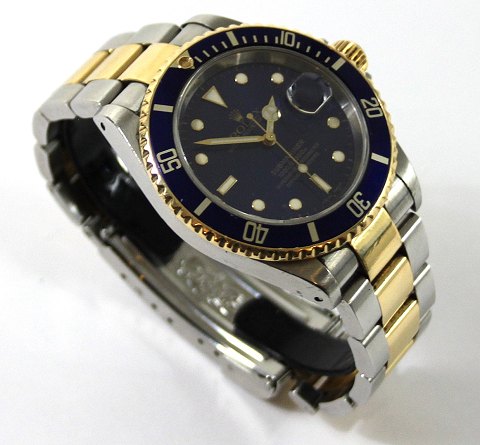 Herrearmbåndsur Rolex, model Submariner, referencenummer 16613, i kasse og med oysterlænke af guld og stål, midnatsblå farvet skive med stregindeks, central sekundviser, guldlynette, datoangivelse ved 3" position, safirglas, automatisk urværk. Urkasse 39 mm. i diameter.