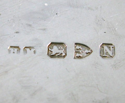 Engelsk thédåse af sterling sølv, korpus med skævdrevet voluttemønster og paddehatformet låg med samme dekorationer. H. 9 cm., vægt 140 gr.