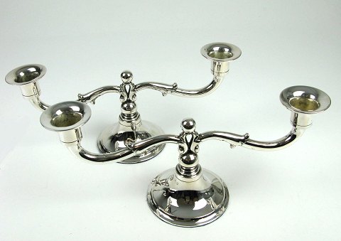 Par udfyldte GL lysestager på rundt fodstykke, herover kogledekoration og 2 arme med trompetformet manchet. H. 12, 5 cm, arme ca. 28,5 cm. Fremstillet i 1934.