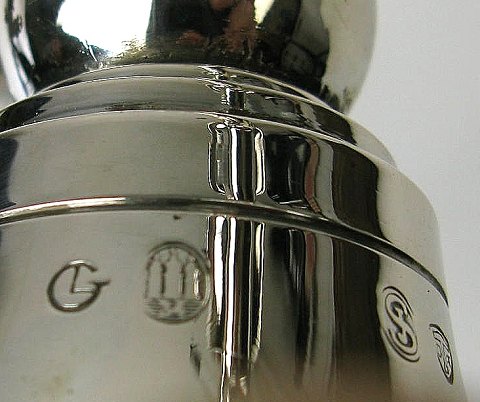 Par udfyldte GL lysestager på rundt fodstykke, herover kogledekoration og 2 arme med trompetformet manchet. H. 12, 5 cm, arme ca. 28,5 cm. Fremstillet i 1934.