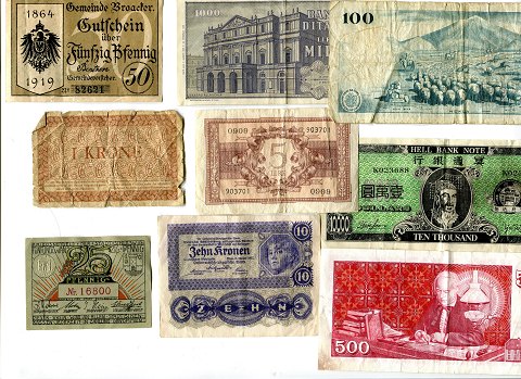 Italien 1000 og 5 lire, Island 500 og 100 kronur, Østrig/Ungarn 10 kronen, Broager og Sleswig 10 og 25 Pfennig, Det Kgl. Danske Krigsministerium 1 Krone samt USA 10000 $ Hell Bank Note.