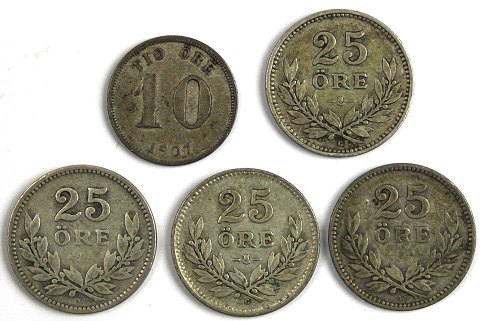 Sverige, Oscar II/Gustav V 10 øre og 4x 25 øre sølv
