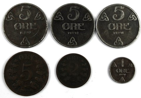 1 øre okkupationsmønt 1942, 2 øre Oscar II 1884, 5 øre Oscar II 1878 samt 3x 5 øre okkupationsmønt 1941 og 1942 (2).
