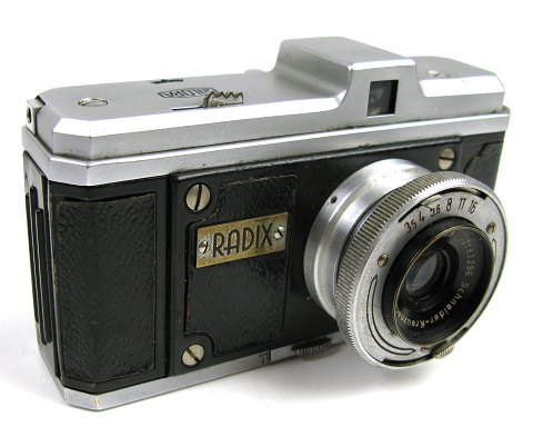 Bilora kamera, model Radix 35, tidlig model med Radionar 3,5 linse. Fremstillet hos Kurbi & Niggeloh i Radevormwald, Tyskland mellem 1949 til midten af 1950'erne.