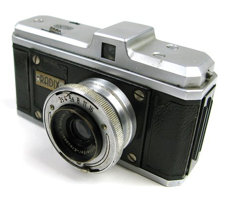 Bilora kamera, model Radix 35, tidlig model med Radionar 3,5 linse. Fremstillet hos Kurbi & Niggeloh i Radevormwald, Tyskland mellem 1949 til midten af 1950'erne.