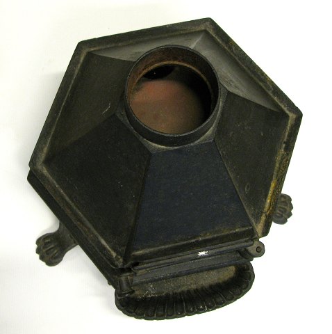 Støbejernsovn med askeskuffe og skorstensadgang. Brugt i vaskerier til opvarmning af strygejern. H. ca. 40 cm.