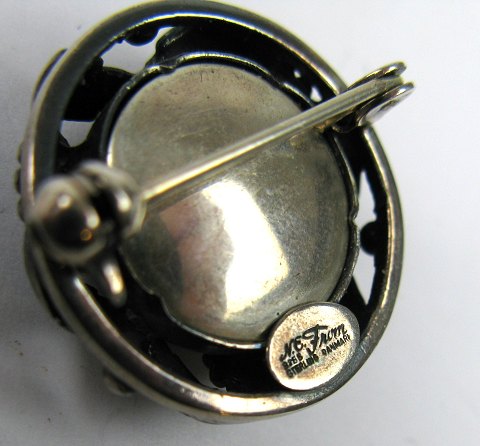 Broche af sterling sølv, prydet med omløbende blomsterranke og poleret ravperle. Diameter 25 mm. Fremstillet efter 1944.