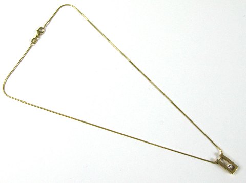 Halssmykke bestående af sirlig, rund halskæde samt U-formet vedhæng, prydet med brillantsleben diamant på 0,15 ct. Kæde L. ca. 40 cm., vedhæng 15 x 7 x 4 mm. Vægt 6,2 gr.