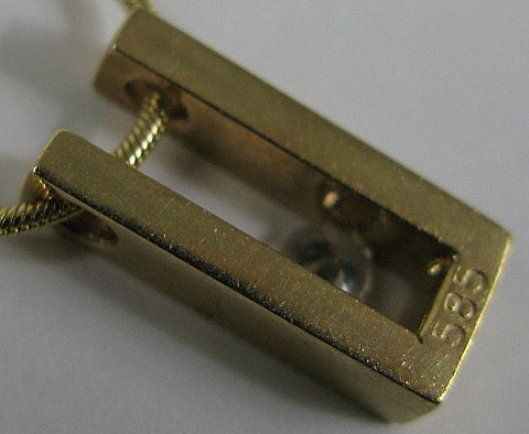 Halssmykke bestående af sirlig, rund halskæde samt U-formet vedhæng, prydet med brillantsleben diamant på 0,15 ct. Kæde L. ca. 40 cm., vedhæng 15 x 7 x 4 mm. Vægt 6,2 gr.