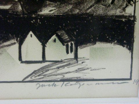 Jack Kampmann, signeret og nummereret 61/100 litografi i form af et færøsk landskab med huse. Dateret 19.., indrammet med passepartout bag glas.
