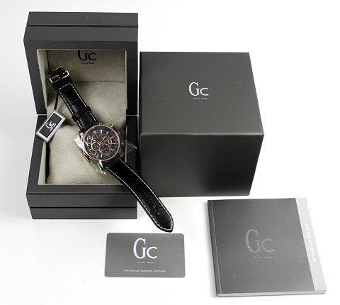 Schweizisk herrearmbåndsur model Gc technoclass, reference X81007G2S i urkasse af stål med betjeningsknapper og krans af delvist forgyldt stål.. Sort skive bag safirglas med chronograph funktioner, separat sekundviser, tachymeterfunktion (til hastighedsberegning) og 6x datovisning i "3 position. Schweizisk Quartsværk R3540D. Urkasse diameter 45 mm.