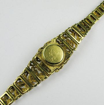 Massiv Alpina armlænke med smykkeur af 18 kt. guld. Oplukkelig lænke, bag hvilken lille ur med hvid skive, stregindikationer og optræksværk. Lænke L. ca. 18,5 cm.