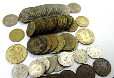 20 x 10 kronur, 9 x 5 kronur, 8x 2 kronur, 28 x 1 krona samt 7x 5 aurar. Diverse årgange.