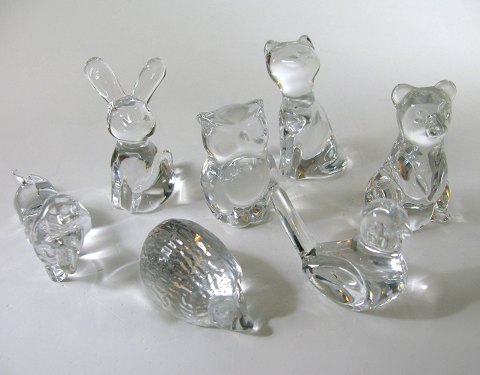 Lot bestående af glasfremstillet gravhund, missekat, hare, ugle, fugl, pindsvin og bamse. sidstnævnte med lille skår i poten foran - eller ingen afslag eller revner konstateret.