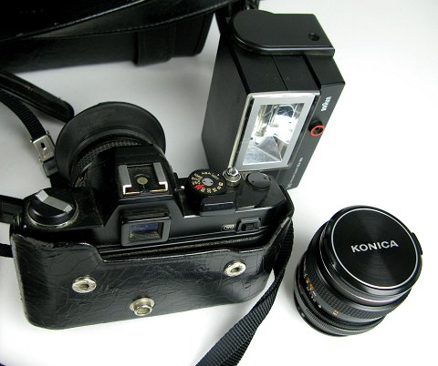 Konika Autoreflex TC kamera med Hexagon AR 50 mm. og Hexagon AR 28 mm. objektiv samt Braun Ultrablitz 34 M, betjeningsvejledning, fjernudløser og stor fototaske. Konishiroku Co., Japan 1976 - 1978