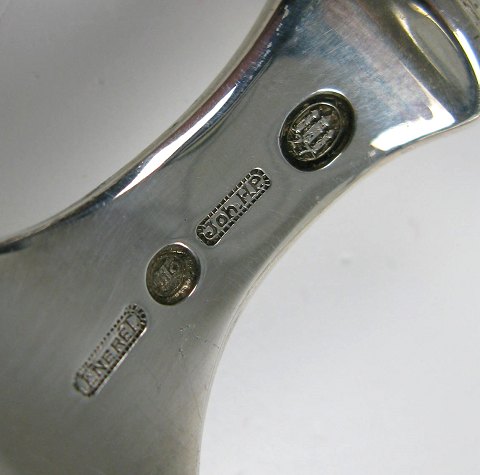 Joh. H.P. fiske serveringsbestik af sølv, stemplet Joh. H.P., København 1927 og "Eneret". Spade L. 28 cm. Samlet vægt 246 gr.