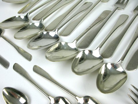 Dansk bestik bestående af 11 middagsgafler, 1 middagsske, 6 frokostskeer, 3 kagegafler, 11 théskeer, sauceske og kartoffelske. 34 dele, vægt 1358 gr.