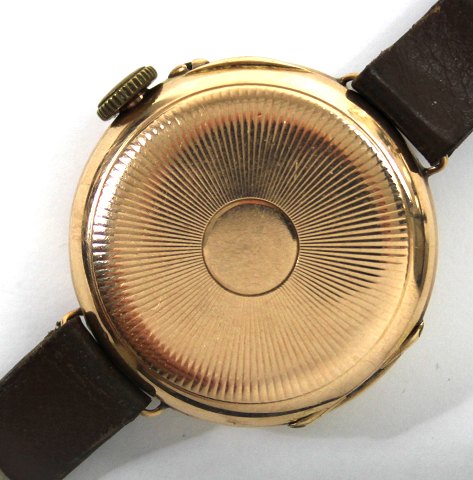 Schweizisk, enkeltkapslet armbåndsur af 14 kt. guld med hvid skive og arabertal. Urkasse diameter 32 mm. Totalvægt 28 gr.