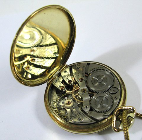 Enkeltkapslet, amerikansk Burlington lommeur i kasse af gulddouble, serie 506XXXX med sølvfarvet skive, arabertal og separat sekundviser. Urkasse diameter 43 mm. Skive med fugtskade. Urkæde af metal medfølger.