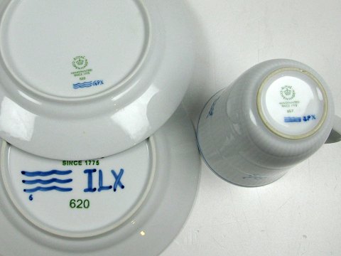 Lot bestående af *Musselmalet riflet* krus, underkop *Megamussel riflet* samt underkop *Halvblonde riflet*. Underkopper diameter 19 cm., krus H. 11 cm. 1. sortering.