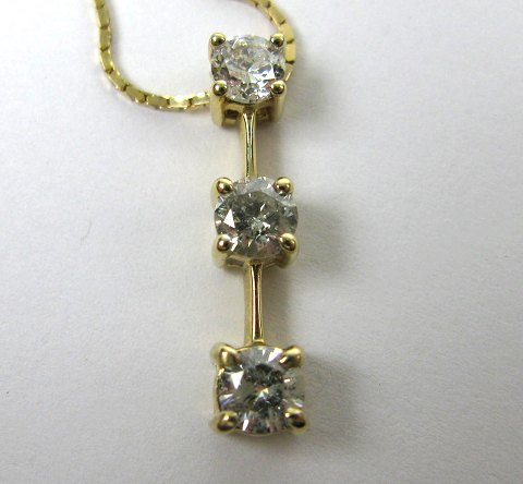 Vedhæng af 14 kt. guld i form af tre kuber, hver med brillantsleben diamant i forløb på henholdsvis 0,25 ct., 0,30 ct. og 0,35 ct., samlet 0,90 ct. Vedhæng L. 22 mm. Sirlig kæde af gulddoublé, L. 40 cm. medfølger.