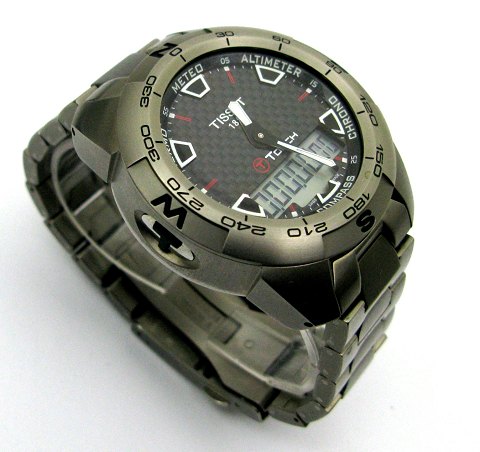 Tissot Touch Expert herrearmbåndsur i urkasse og med lænke af titanium, ref. nr. T013420A med sort struktureret skive bag safirglas. Stregindikation, 2 tidszoner, 2 alarmer, nedtælling, stopur, højdemåler, kompas med azimuth funktion, termometer, barometer med høj og lav tryk, evighedskalender, rødt lys i display. Quartsværk. Urkasse diameter 43,5 mm.