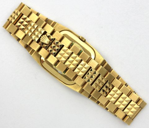 Sjælden Rolex Genève (Cellini King Midas type) herrearmbåndsur i urkasse og med lænke af 18 kt. guld. Profileret skive med oktogon krans, prydet med 32 brillantslebne diamanter. Manuel mekanisk optræksværk. Ref. nr. 5153. Urkasse 27 x 35 mm.