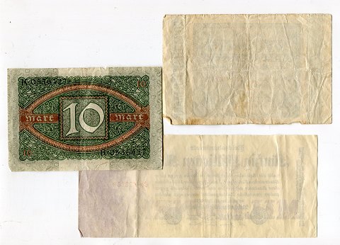 Følg den tyske inflations udvikling i 1920'erne - lot med 10 Mark seddel 1920, 50 millioner Mark Juli 1923 og 20 milliarder Mark oktober 1923!