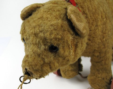 Schuco teddybjørn med brumstemme på træhjul og stel af metal. Brumstemmen udløses ved træk i snoren. L. 40 cm.