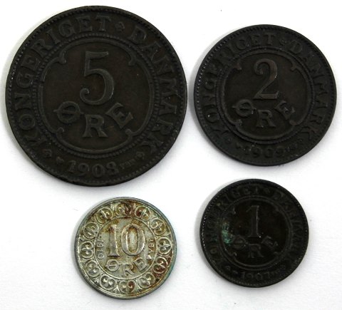 Frederik VIII, 10 øre sølv samt 5, 2 og 1 øre (4)
