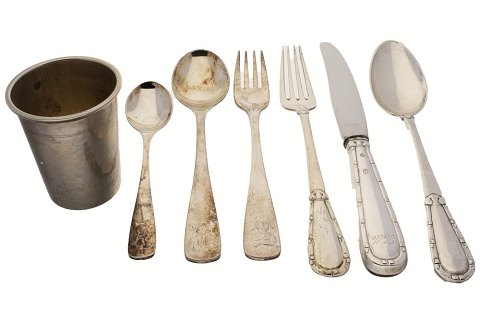 Lille bæger af sølv samt bestiksæt af sølv (kniv med skaft af sølv). Sølvvægt ca. 150 gr
