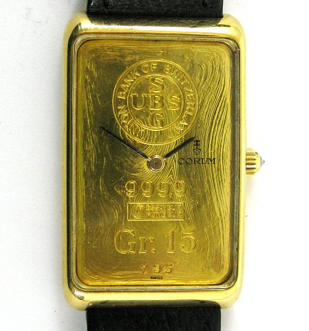 Corum herreur i 18k guld med sort læderem, urværket er bygget ind i en finguld guldbarre på 15 gr., dia. 24 x 41 mm. manuelt optræk. Krone med diamant Samlet vægt 47,3 g