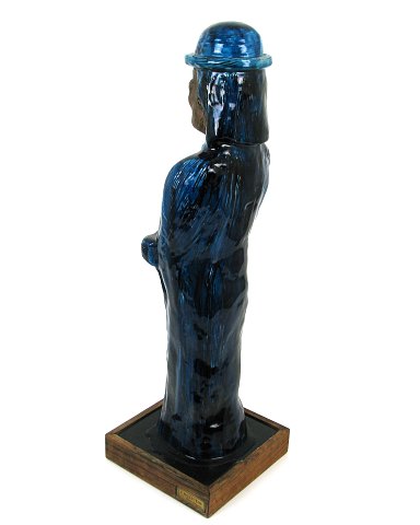 Figur på ligesidet træfod i form af mand i kåbe med uglaseret ansigt. H. 56 cm. Mrk. J. Holstein, Danmark.