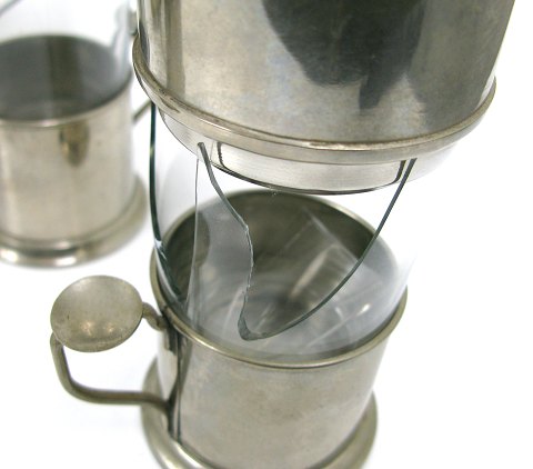6 formodentlig russiske thébryggere i form af drikkeglas med théfilter opsatse af metal. H. 20 cm.