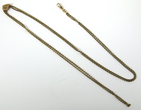 Lommeurskæde af forgyldt metal, løber prydet med kulturperle. L. 69 cm.
