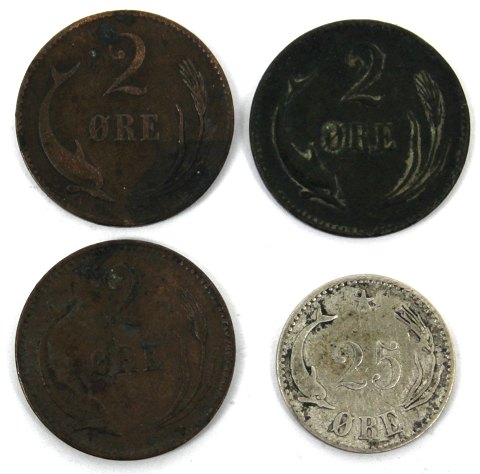 Christian X 25 øre sølv 1891 og 2 øre 1874, -75 og -76 (4)