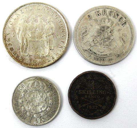 Lot bestående af Oscar II 2 Kronor banko sølv 1880, Carl XIV 2/3 skilling banko 1837, Gustav V Adolf kr. sølv 1929 samt Gustav VI Adolf 5 kr sølv 1959.