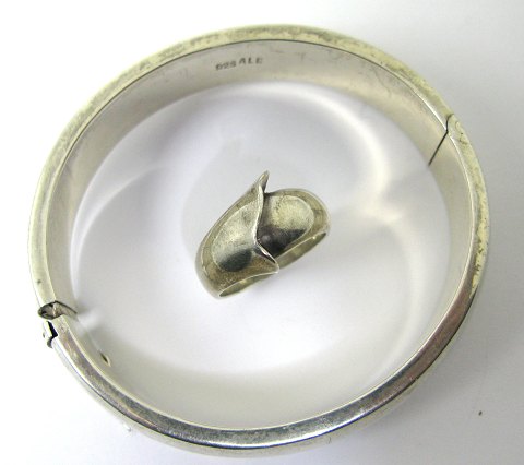 Bred armring af sterling sølv, indvendigt mål 60 x 55 mm. samt ring af sterling sølv med front i form af blomstertragt. Ring Str. 55