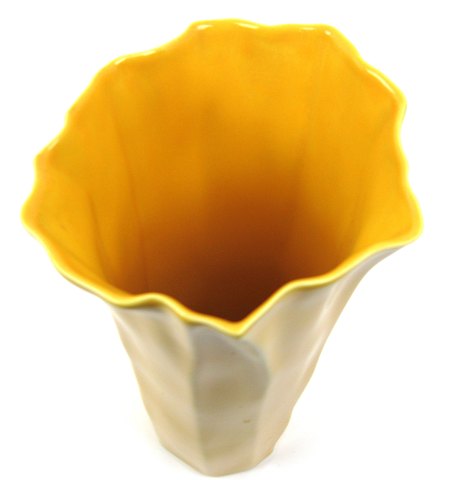 Kgl. vase af æggegul glaseret keramik med udbøjet svejfet kant. H. 27 cm.