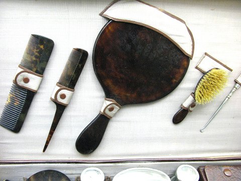 Nostalgisk rejsekuffert af læder, indrettet med adskillige toiletsager, delvis af skildpadde. Kuffert 54 x 33 x 14 cm.