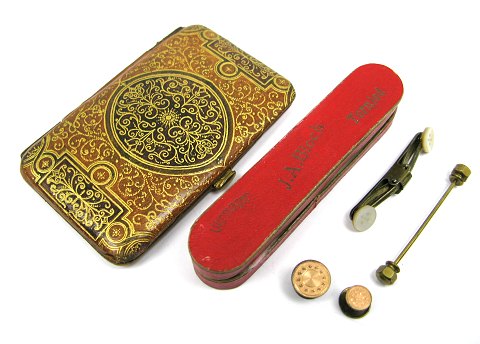 Snustobaksetui af guldpræget læder 8,5 x 5,5 cm., 4 kraveflip knapper i original salgsæske samt vedhæng af udskåret ben. Alle dele fra slutningen af 1800'tallet.