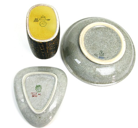 Lot bestående af Royal Copenhagen krakelé skol, diameter 21 cm., KPM tresidet skål af krakelé porcelæn, 15 x 13,5 cm. samt Aluminia vase dess. 724/3207.
